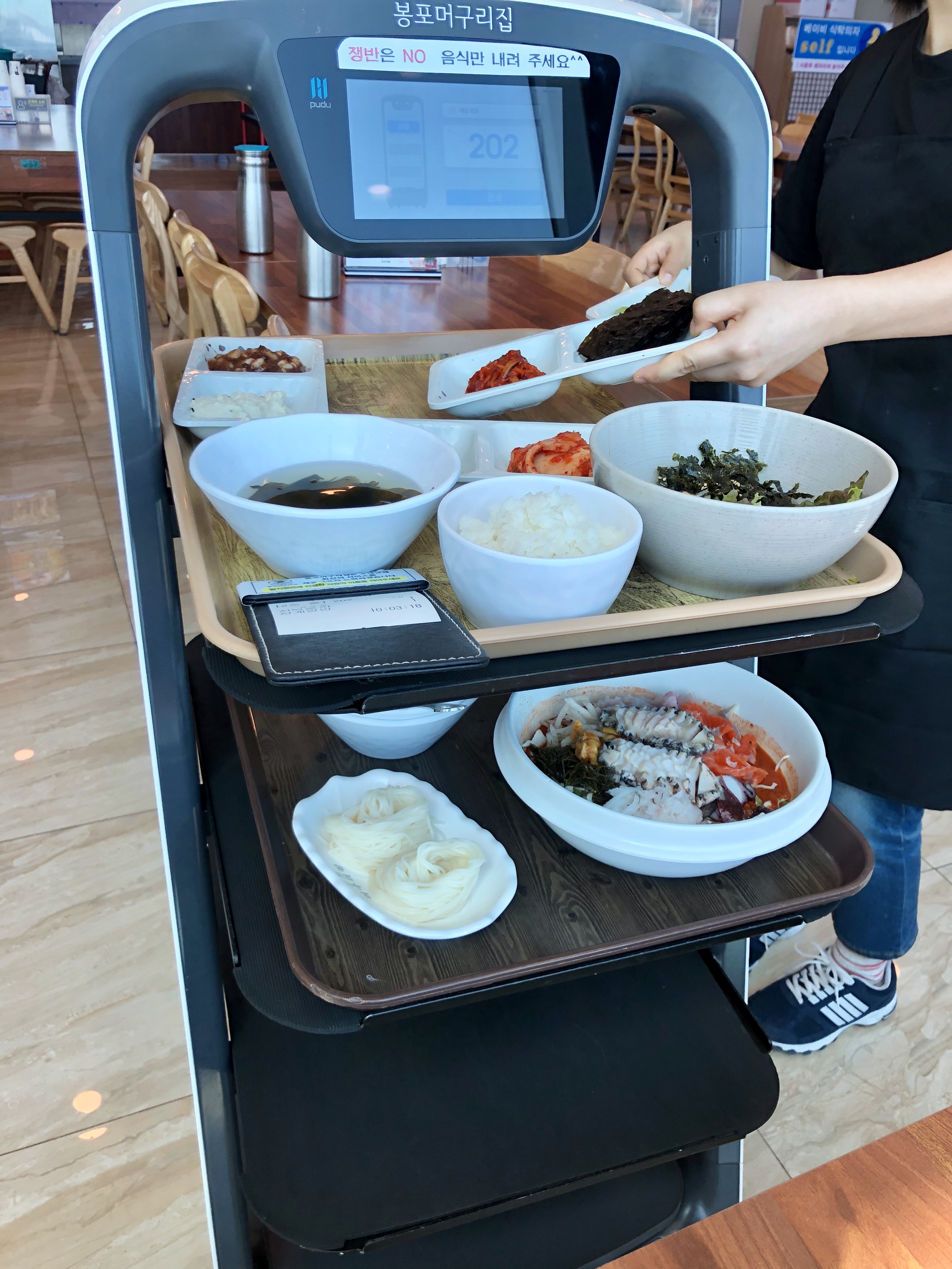 10분도 지나지 않아 음식이 올려져 있는 서빙로봇이 테이블 옆까지