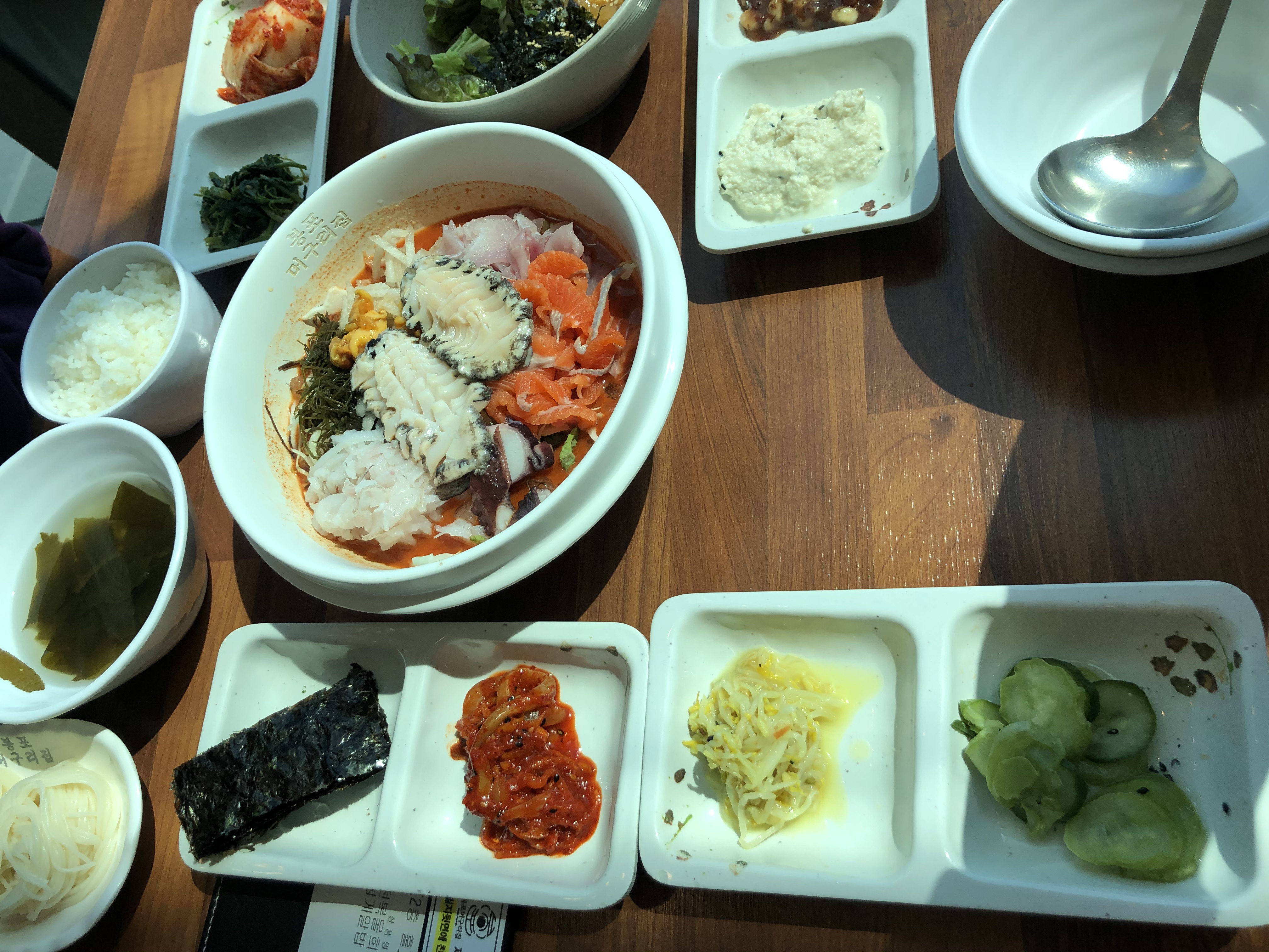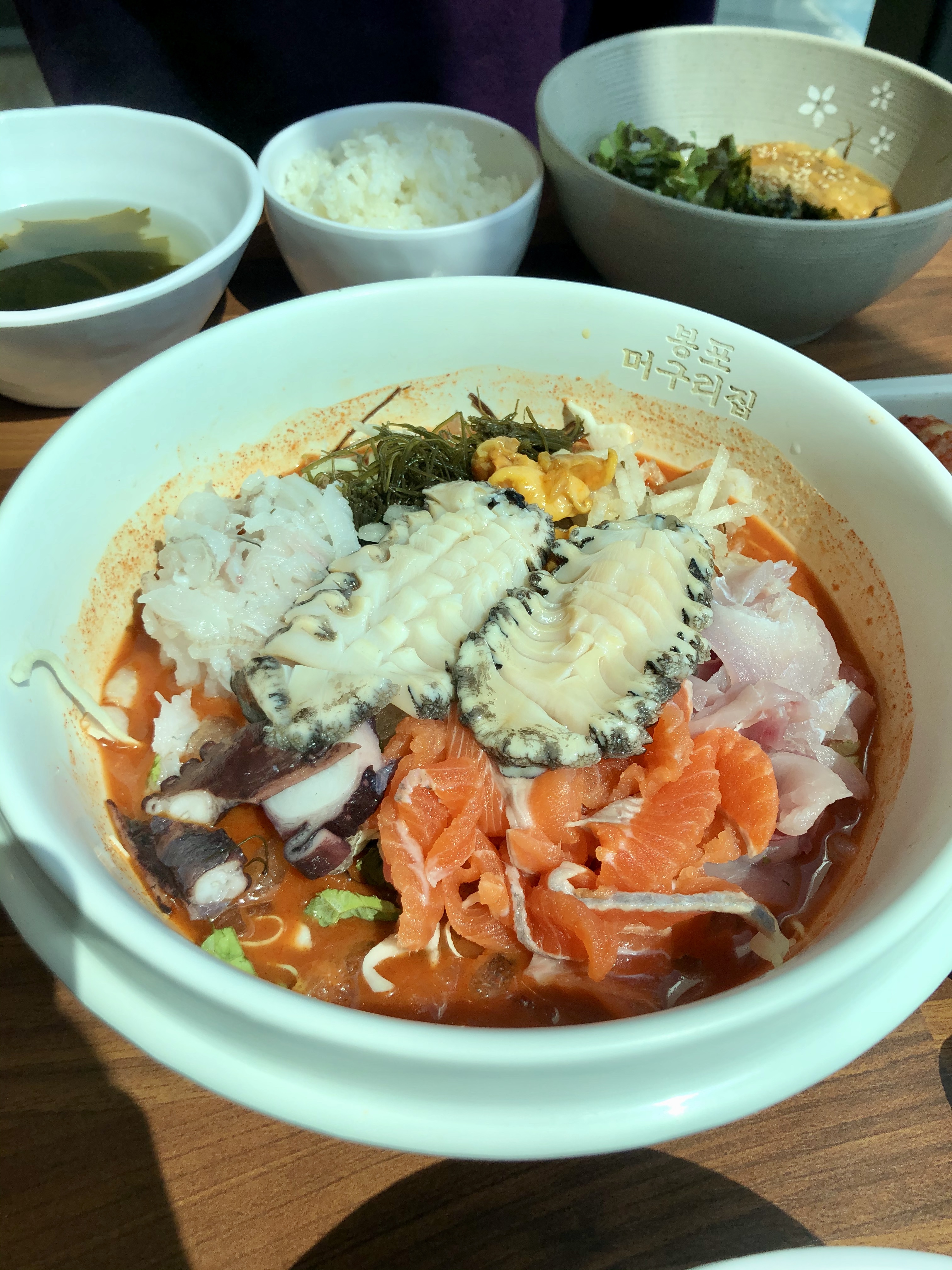 물회는 전복, 멍게, 송어, 한치, 세꼬시, 문어, 해초 가 올라가 있었는데