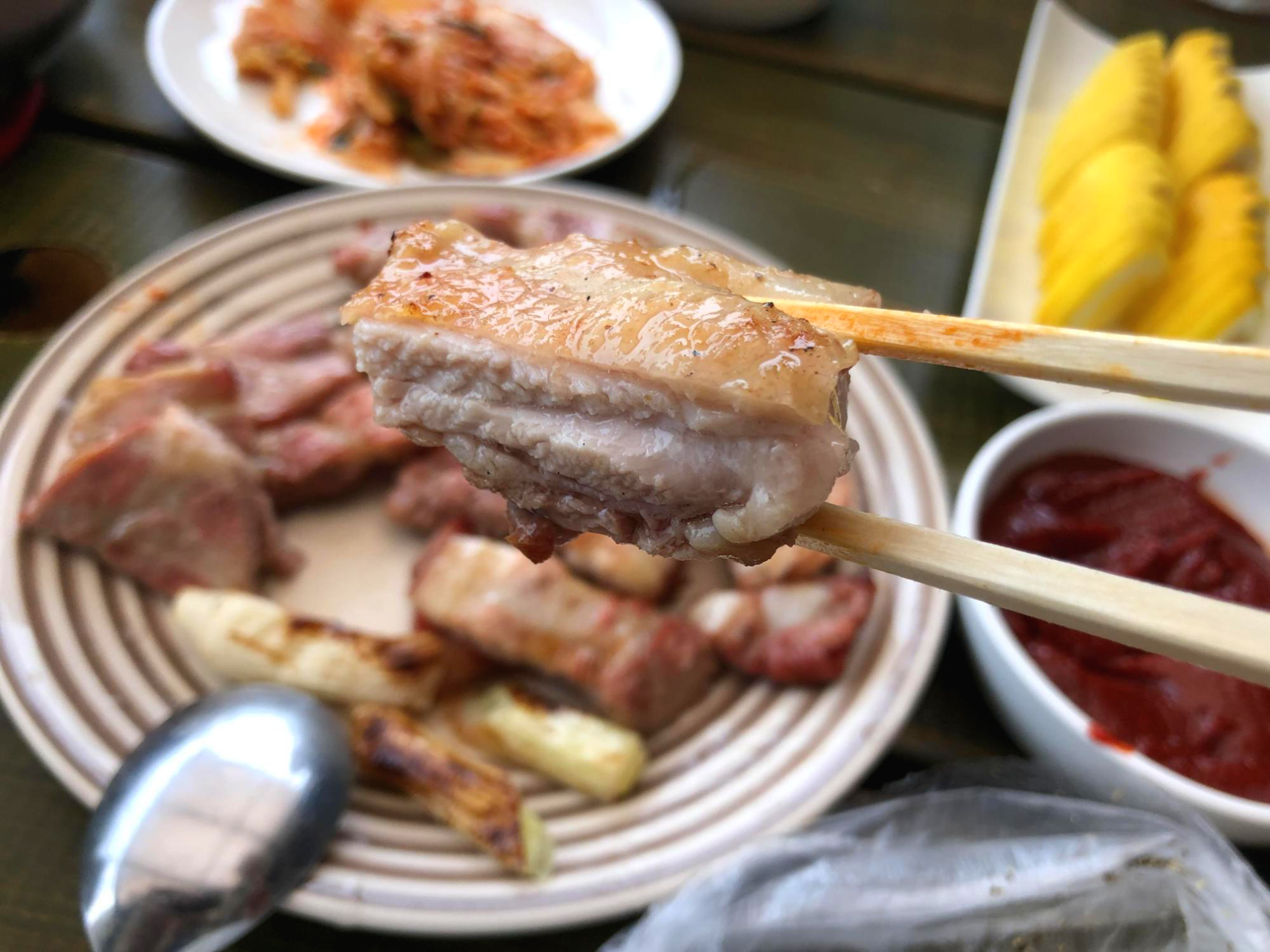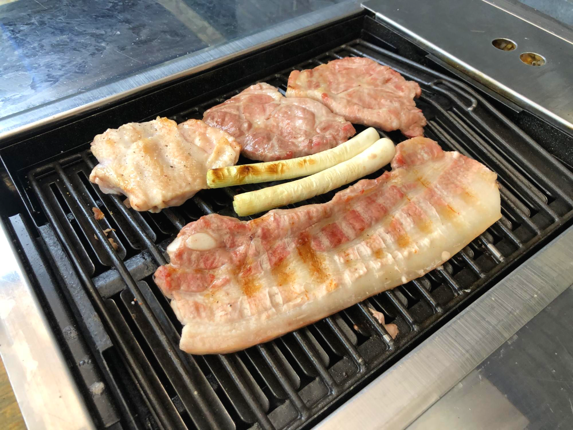 닭다리살, 목살, 삼겹살, 대파 모두 안정적으로 익어갔다.