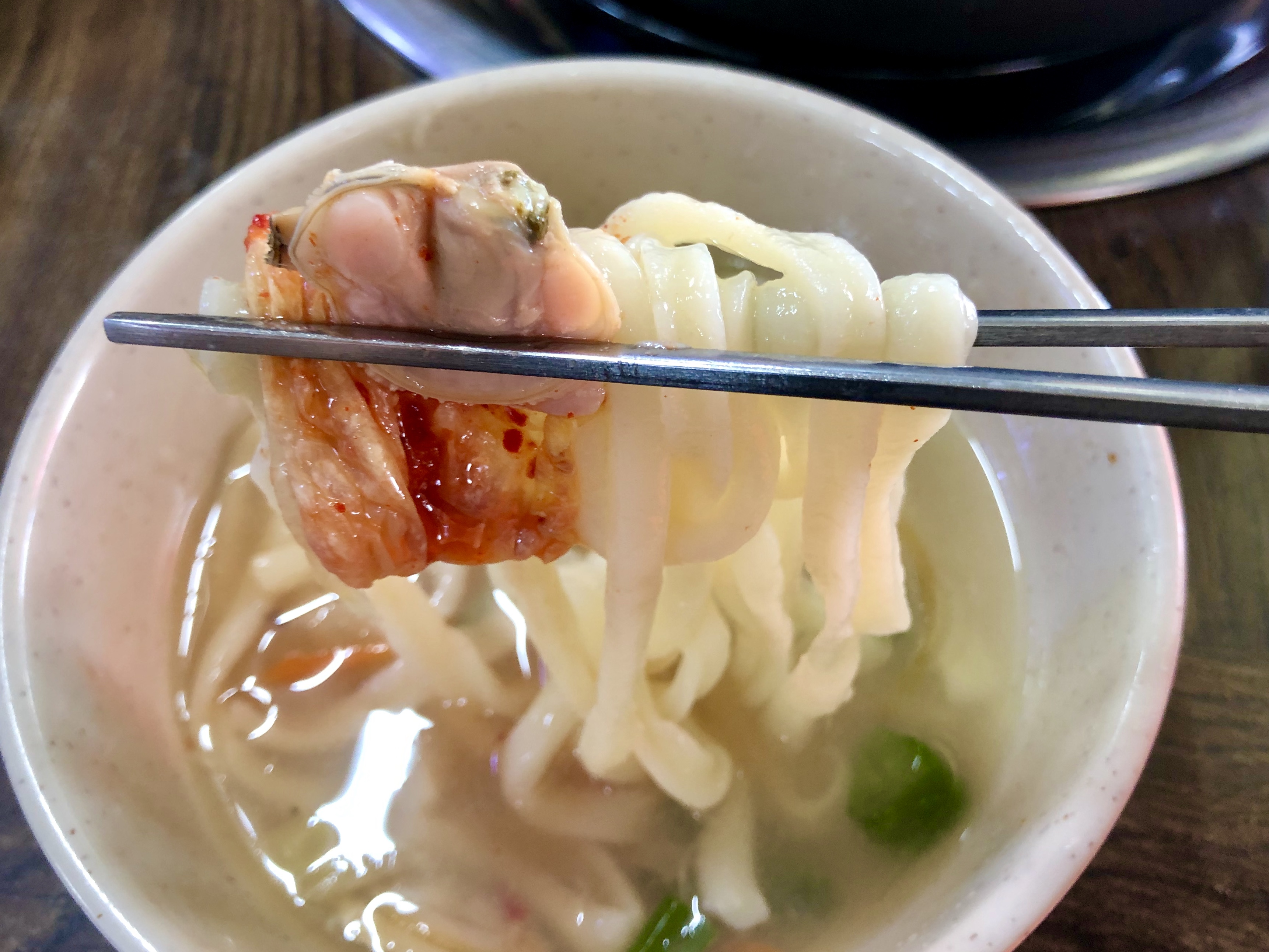 백합 살을 발라 칼국수와 함께 수저에 올려놓고