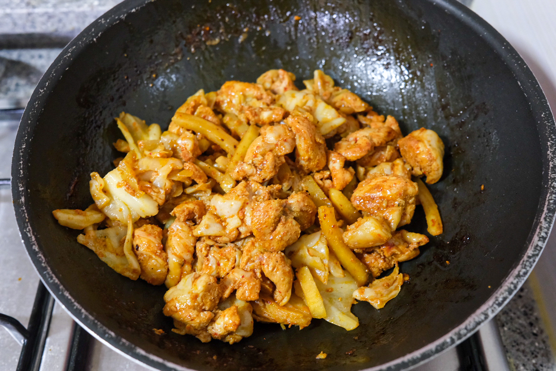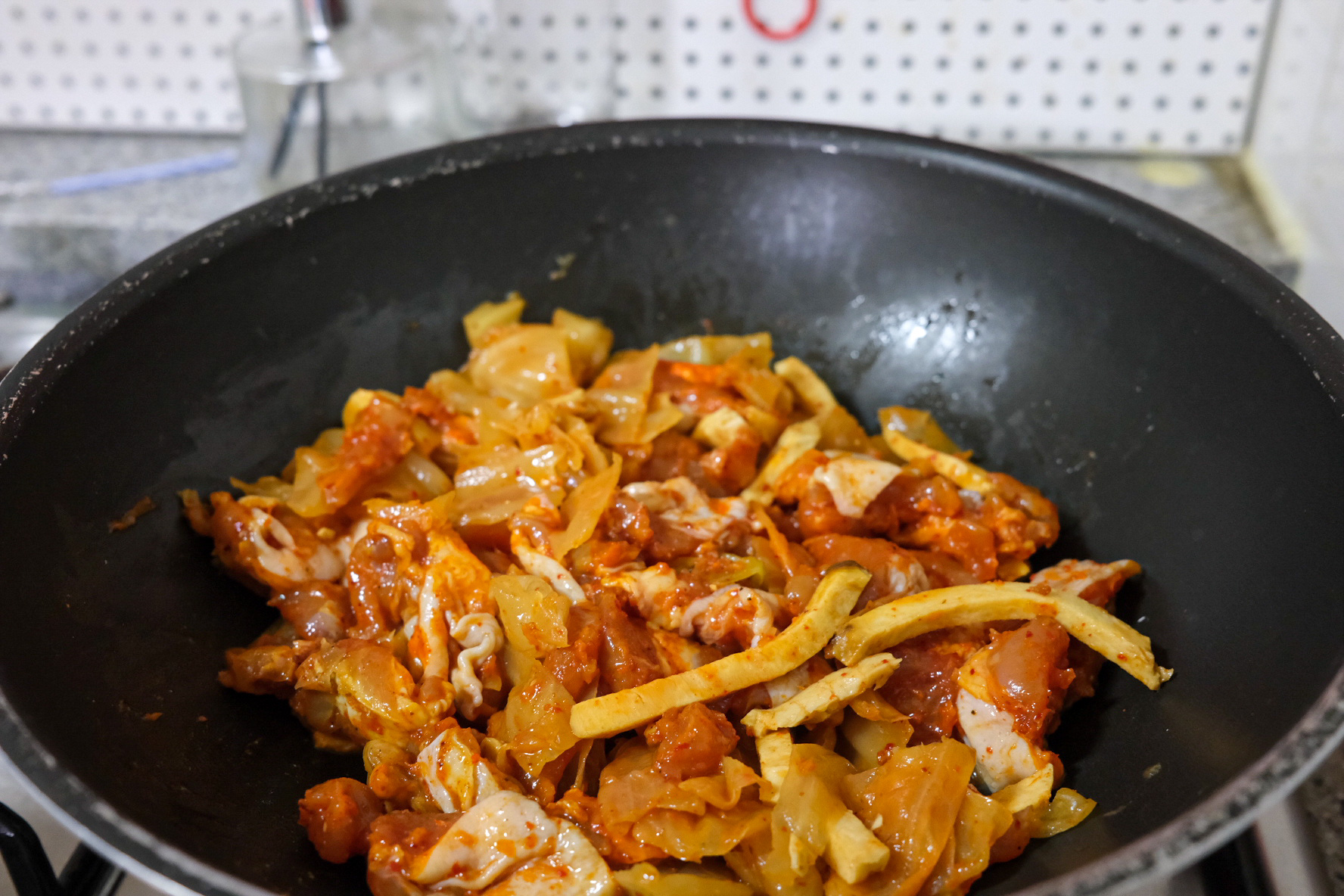 양념 닭갈비에 양배추와 고구마채가 함께 버무려져 있다.